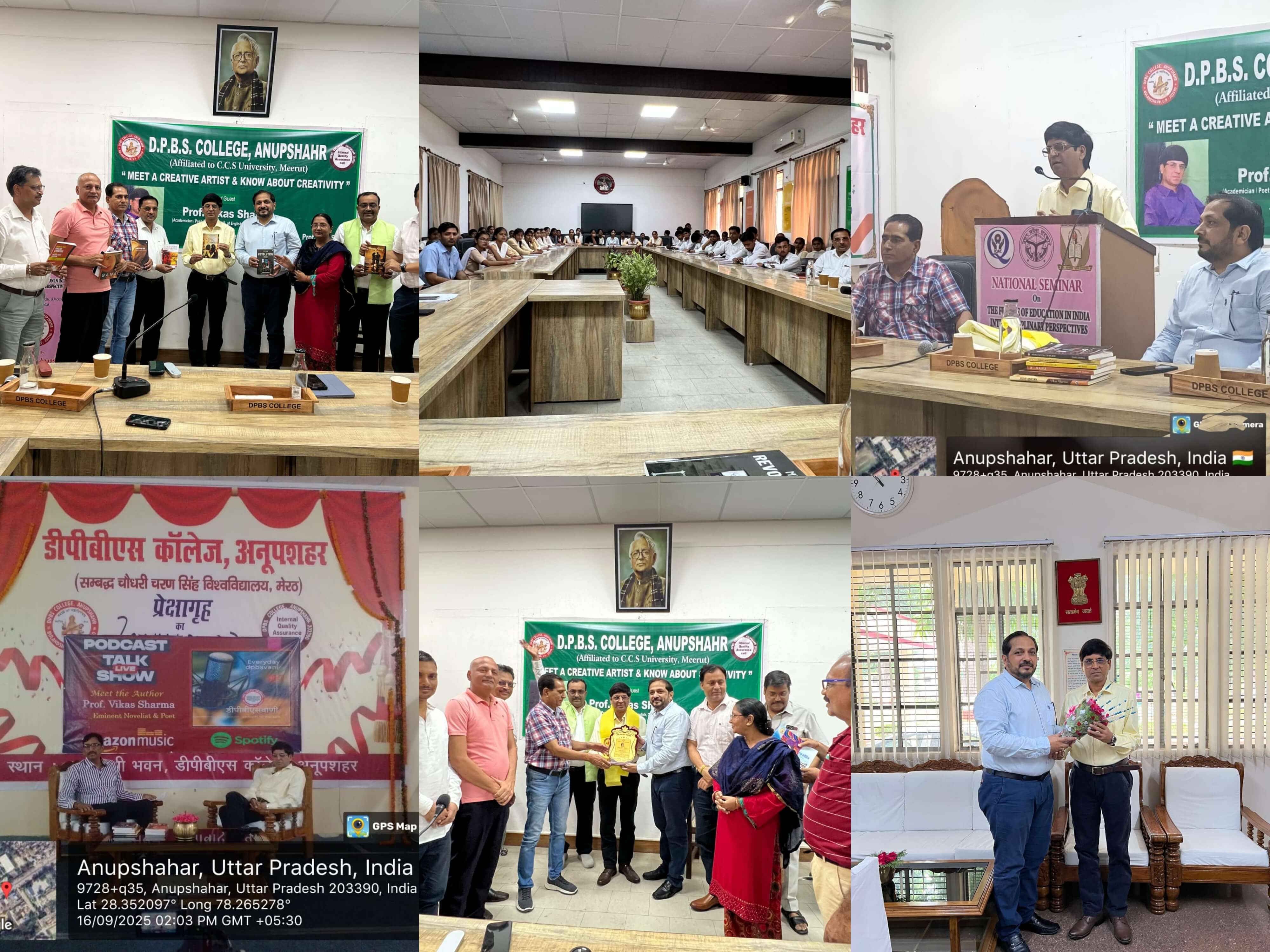 दिनांक 16.09.2025 को डीपीबीएस कॉलेज अनूपशहर में प्राचार्य प्रो.जी. के. सिंह की अध्यक्षता में भाषा संकाय के तत्वावधान में हिंदी दिवस बड़ी धूमधाम से मनाया गया। कार्यक्रम का शुभारम्भ मां सरस्वती के सम्मुख दीप प्रज्वलन एवं पुष्पार्चन से हुआ। इसके उपरांत महाविद्यालय के प्राचार्य प्रोफेसर जी. के. सिंह, वरिष्ठ प्राध्यापक प्रोफेसर पी के त्यागी, प्रोफेसर सीमांत कुमार दुबे, प्रोफेसर चंद्रावती ,प्रोफेसर ऋषि कुमार अग्रवाल, डॉक्टर यजवेंद्र कुमार ने मुख्य अतिथि का अंग वस्त्र भेंट करके स्वागत किया। इस कार्यक्रम का इसका विषय रहा "मीट ए क्रिएटिव राइटर एंड नो अबाउट क्रिएटिविटी" इस अवसर पर विशेष आकर्षण रहे सुप्रसिद्ध उपन्यासकार एवं मेरठ विश्वविद्यालय के अंग्रेजी विभाग के प्राध्यापक प्रोफेसर विकास शर्मा ने बताया कि लगभग 40 पीएच डी उनके ऊपर देश- विदेश में लिखी जा रही हैं। उन्होंने बताया कि उनके दो ही प्रेम है राजनीति और साहित्य। अपने वक्तव्य में प्रोफेसर शर्मा ने बताया कि अनूपशहर से उनका विशेष लगाव है और उनके साहित्यिक प्रेम अनूपशहर से ही पल्लवित हुआ। उन्होंने अपने पहले उपन्यास राह के पत्थर के बारे में बताते हुए कहा कि रचनाकार संवेदनशील होता है प्रोफेसर शर्मा ने बताया कि उन्होंने तेरह उपन्यास लिखे हैं। उन्होंने कहा कि विचार महत्वपूर्ण है न की भाषा। उन्होंने बताया कि वर्तमान सरकार मातृभाषा के प्रति प्रेम पैदा कर रही है अतिरिक्त उन्होंने अपने विभिन्न उपन्यासों इस टुडे हनी ट्रैप जो लंदन से प्रकाशित हुआ, मीडिया रिवॉल्यूशन 2020 जिसका हिंदी व पंजाबी में भी अनुवाद हुआ इत्यादि की भी विस्तृत चर्चा की। उन्होंने विद्यार्थियों को बताया क्रिएटिव राइटर कैसे बन सकते हैं। अंत में उन्होंने अपनी कविता आज "फिर मेरी आंखों में आंसू न थे" का पाठ भी किया।