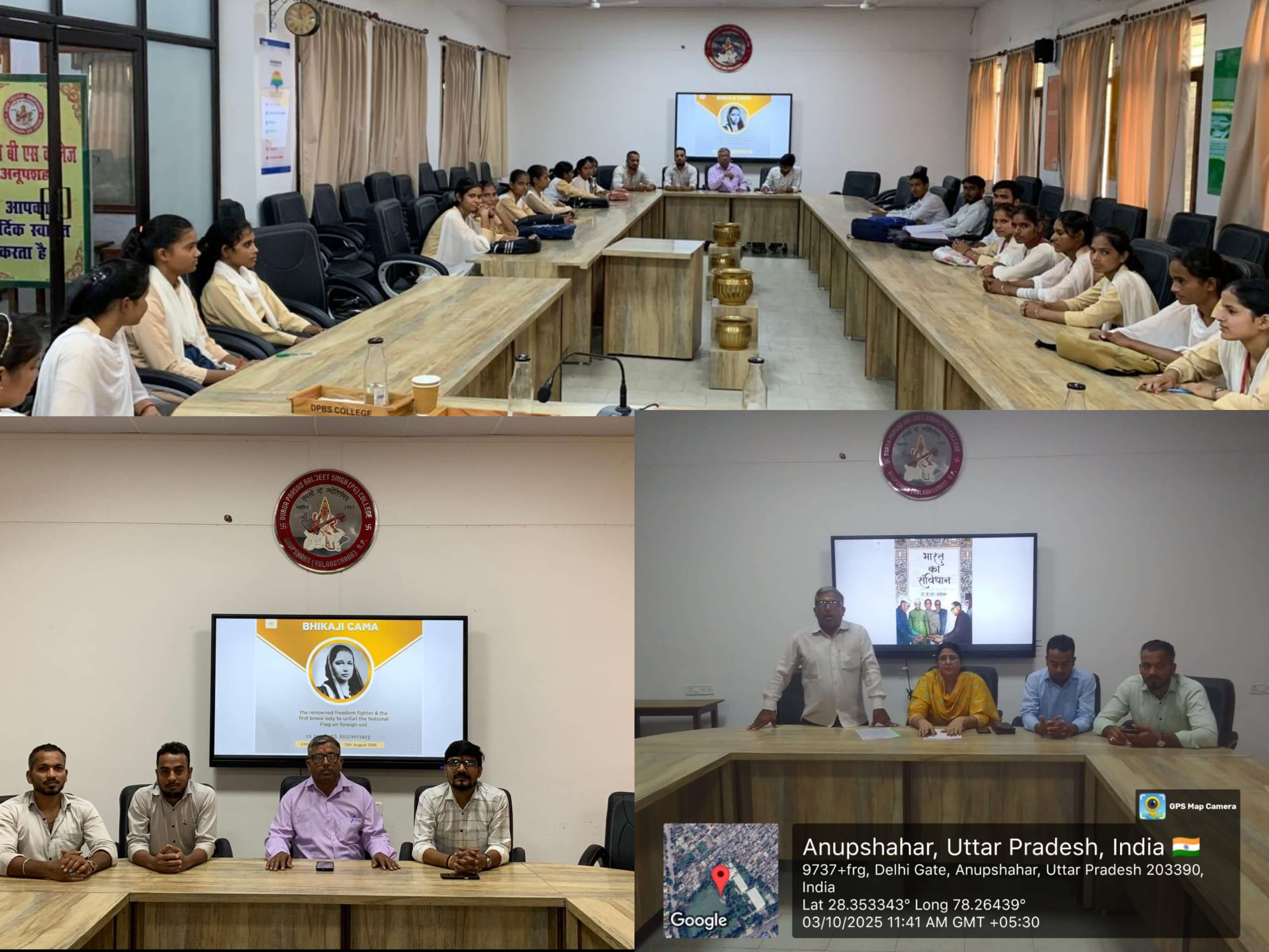 डीपीबीएस महाविद्यालय में दिनांक 24 सितम्बर 2025 को इतिहास विभाग ओर से महान स्वतन्त्रता सेनानी भीकाजी कामा के जन्म दिवस के उपलक्ष में एक संगोष्ठी का आयोजन किया गया इस अवसर पर उनके योगदान को याद किया गया और भारत की स्वतन्त्रता संग्राम में उनकी भूमिका पर प्रकाश डाला गया प्राचार्य ने अपने विचार व्यक्त करते हुए कहा कि भीकाजी कामा भारत की उन महान विभूति थी जिन्होंने विदेश की भूमि पर तिरंगे का परचम लहराया और भारत की स्वतन्त्रता की आवाज विश्व मंच तक तक पहुचायी 1907 में जर्मनी के स्टटगार्ड में आयोजित अंतर्राष्ट्रीय सम्मेलन में उन्होंने पहेली बार भारतीय ध्वज फेहराया