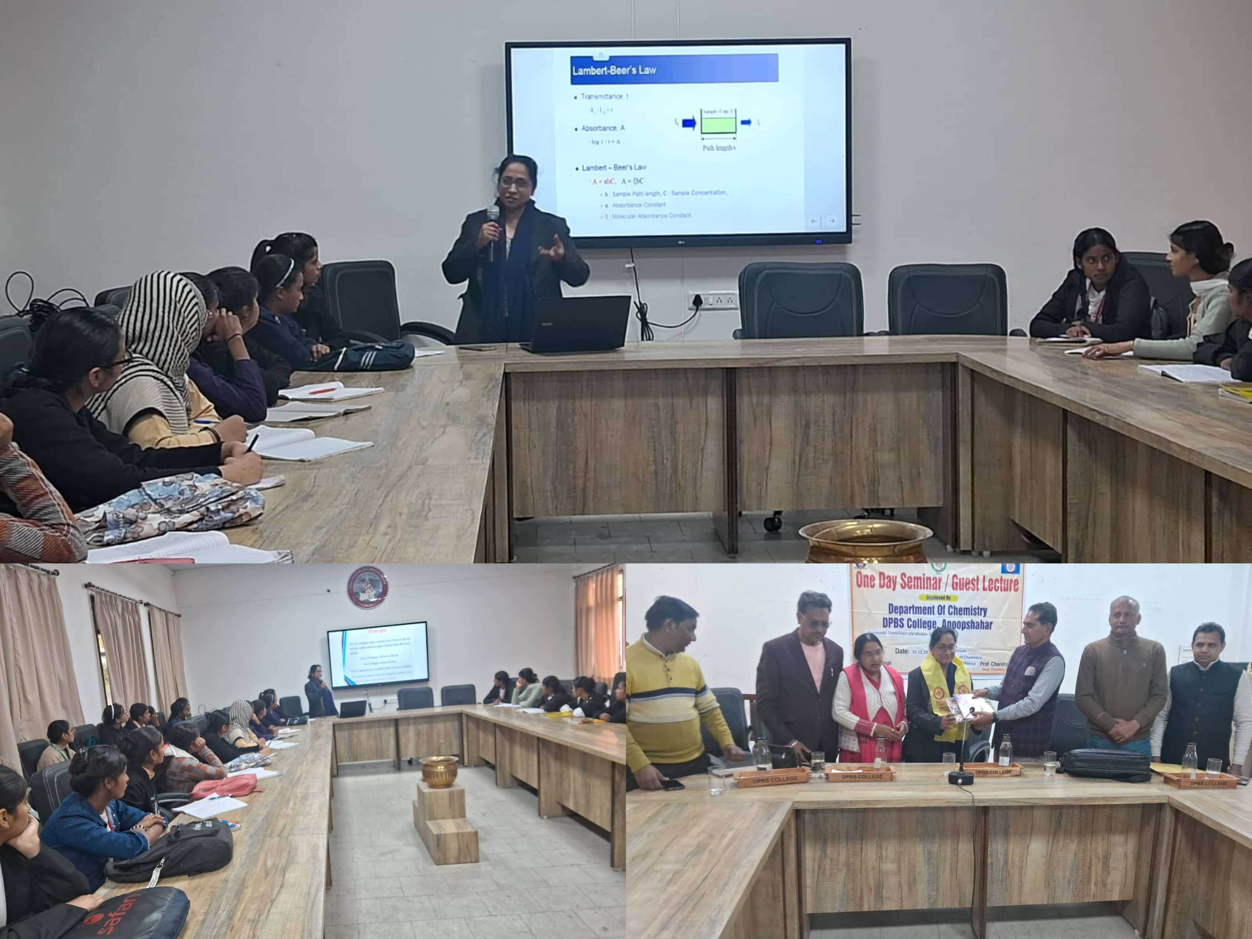 दिनांक 12.12.2025 को रसायन विभाग में महाविद्यालय के प्राचार्य प्रो. जी. के. सिंह के निर्देशन और प्रो. पी. के. त्यागी की अध्यक्षता में एक दिवसीय अतिथि व्याख्यान विषय–"इलेक्ट्रॉनिक ट्रांज़िशन एवं पराबैंगनी या दृश्य स्पेक्ट्रोस्कोपी" का आयोजन किया गया। जिसमें मुख्य वक्ता प्रो. नाजिया तरन्नुम, रसायन विभाग, चौधरी चरण सिंह विश्वविद्यालय, मेरठ ने इलेक्ट्रॉनिक ट्रांज़िशन एवं पराबैंगनी या दृश्य स्पेक्ट्रोस्कोपी की व्याख्या करते हुए विस्तार से बताया कि जब कोई अणु प्रकाश ऊर्जा को अवशोषित करता है, तो उसके इलेक्ट्रॉन निम्न ऊर्जा स्तर से उच्च ऊर्जा स्तर में पहुँचते हैं।