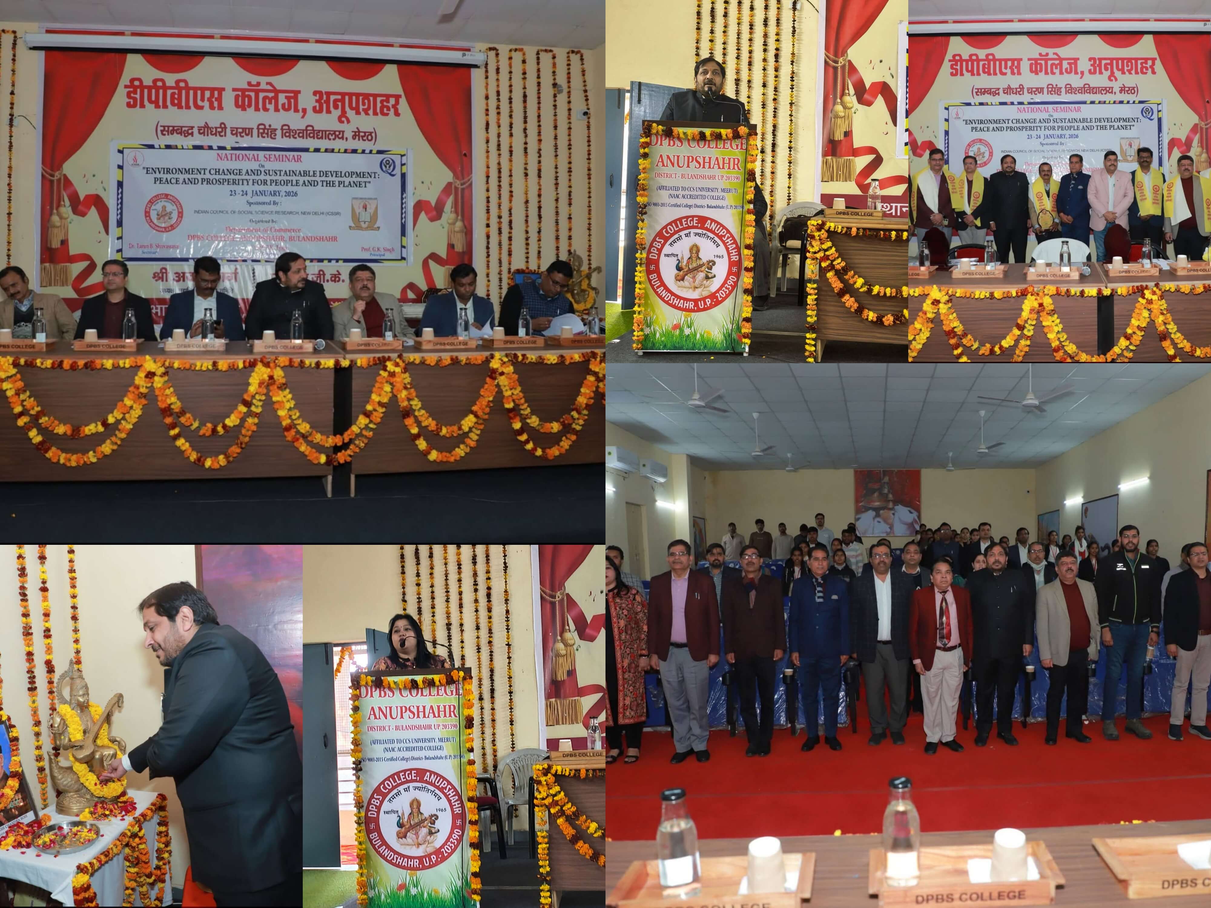 दिनांक 24 जनवरी 2026 को डीपीबीएस महाविद्यालय, अनूपशहर में आईसीएसएसआर द्वारा “पर्यावरण परिवर्तन और सतत विकास: मानव एवं पृथ्वी ग्रह के लिए शांति और समृद्धि (“ENVIRONMENT CHANGE AND SUSTAINABLE DEVELOPMENT: PEACE AND PROSPERITY FOR PEOPLE AND THE PLANET”) विषय पर प्रायोजित दो दिवसीय राष्ट्रीय संगोष्ठी के द्वितीय दिवस के प्रथम विशिष्ट तकनीकी सत्र का शुभारंभ ज्ञान की देवी माँ शारदे की प्रतिमा के समक्ष दीप प्रज्ज्वलन एवं पुष्प अर्पण के साथ हुआ। इस सत्र के स्वागत उद्बोधन में संगोष्ठी संयोजक प्रोफेसर पीके त्यागी ने सभी विशिष्ट वक्ताओं एवं प्रतिभागियों का स्वागत करते हुए पर्यावरणीय समस्याओं के समाधान हेतु जनचेतना एवं जन जागरूकता का आह्वान किया गया। इसके पश्चात सत्र का संचालन करते हुए संगोष्ठी सचिव डॉ. तरुण श्रीवास्तव ने कहा कि प्रगति और प्रकृति के बीच संतुलन ही एक मात्र रास्ता है। इसे ही 'सस्टेनेबल डेवलपमेंट' कहा जाता है, जहाँ हम वर्तमान जरूरतें भी पूरी करें और भविष्य की पीढ़ियों के लिए भी संसाधनों को सुरक्षित रखें। जेपी विश्वविद्यालय से आए हुए डॉ नितिन शर्मा ने 5 पी पीपल, प्लेनेट, प्रोस्पेक्टस, पीस एवं पार्टनरशिप विशेष ध्यान आकर्षित करते हुए कहा कि अब समय कार्य करने का है बातें करने का नहीं रहा उन्होंने कहा शैक्षिक जागरूकता से ही सतत विकास संभव है। जेपी विश्वविद्यालय अनूपशहर के डीन डॉ निशांत शर्मा ने पर्यावरण समस्याओं को उत्पन्न करने के लिए कंप्यूटिंग एवं इंटरनेट को भी एक बड़ा कारक माना है, उन्होंने यह भी कहा कि कृत्रिम बुद्धिमत्ता इन समस्याओं का खोज करने में सक्षम है। श्री राम कॉलेज ऑफ़ कॉमर्स दिल्ली से आए हुए डॉ मयंक गोयल ने पर्यावरण शुद्धता पर बल देते हुए कहा कि औपचारिक शिक्षा द्वारा नागरिकों को जागरूक करने से ही हम सतत विकास का लक्ष्य प्राप्त कर सकते हैं। इस सत्र के कीनोट स्पीकर रहे कुमारी मायावती कॉलेज गौतमबुद्ध नगर के प्रोफेसर दिनेश चंद शर्मा ने मानव स्वास्थ्य पर म्यूजिक थेरेपी के विभिन्न पहलुओं पर प्रकाश डाला उन्होंने कहा म्यूजिक थेरेपी के द्वारा मानसिक तनाव रक्तचाप आदि रोगों को आसानी से दूर कर सकते हैं हमें अपनी आदतों में बदलाव लाना चाहिए जिससे हम स्वस्थ रह सके एवं पर्यावरण को भी संरक्षित कर सके । कॉलेज मेरठ से आए हुए डॉ विवेक त्यागी ने गौरैया चिड़िया का महत्व बताते हुए कहा कि अगर आपको अपने आसपास गौरैया चिड़िया नहीं दिख रही है तो निश्चित तौर पर पर्यावरणीय असंतुलन उत्पन्न हुआ है उन्होंने कहा कि जैव विविधता पर विशेष ध्यान देने की आवश्यकता है। सी एल डिग्री कॉलेज हसनपुर से आए हुए प्रोफेसर राकेश आर्य ने अपने वक्तव्य में कहा कि पर्यावरण औद्योगीकरण की कारण दूषित हुआ है मिथकों एवं भ्रष्टाचार के कारण प्रभावी नीतियां कार
