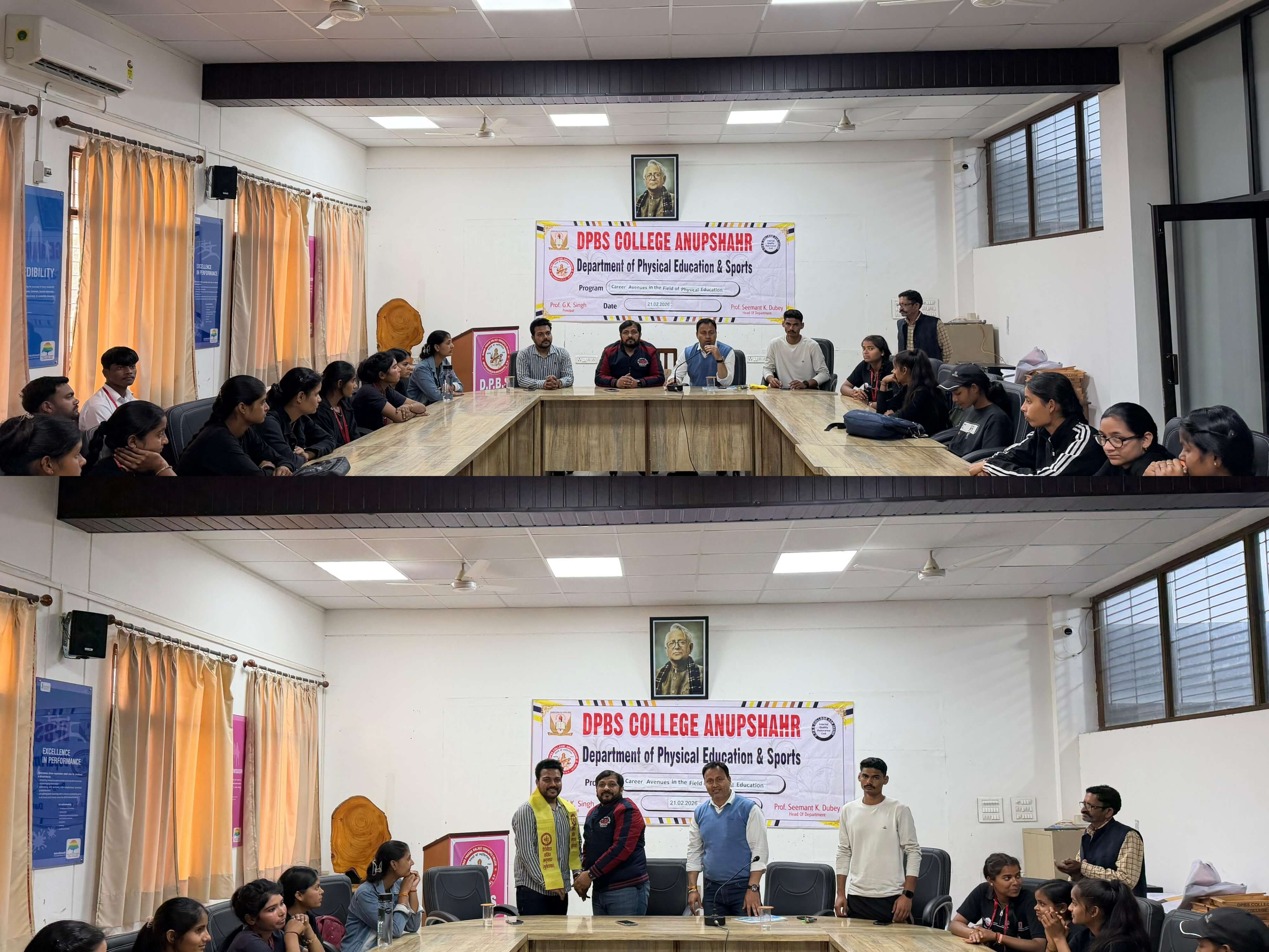 दिनांक 21.02. 2026 को डीपीबीएस महाविद्यालय में प्राचार्य प्रोफेसर जीके सिंह के निर्देशन में महाविद्यालय के शारीरिक शिक्षा विभाग द्वारा “Career Avenues in the Field of Physical Education” विषय पर एक प्रेरक एवं ज्ञानवर्धक अतिथि व्याख्यान का आयोजन किया गया। कार्यक्रम के मुख्य वक्ता डॉ सौरभ पाल, एम एम कालेज गाजियाबाद रहे।